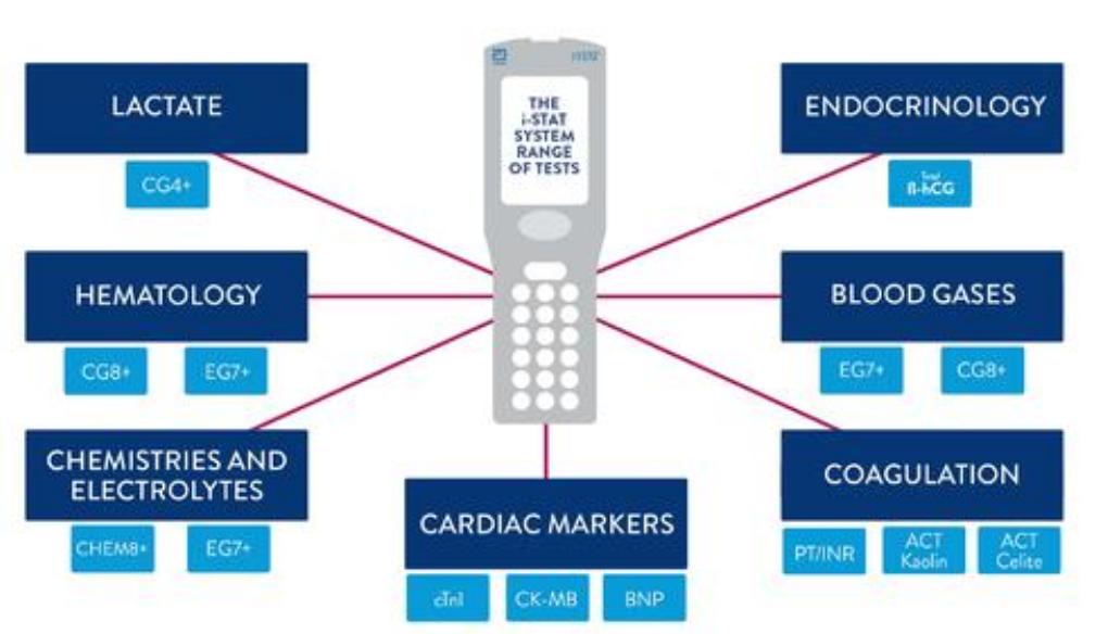 i-STAT System床旁血液監(jiān)護(hù)系統(tǒng)可以幫助臨床醫(yī)生快速多方面了解病人情況,肺/呼吸系統(tǒng):血?dú)猓I臟:肌酐、尿素氮,心肌:肌鈣蛋白I、B型利鈉肽,體液平衡狀況:血?dú)?電解質(zhì)+乳酸,糖代謝:血糖的檢測(cè),血液:紅細(xì)胞壓積、血色素,凝血功能:凝血酶原時(shí)間-國(guó)際標(biāo)準(zhǔn)化比值、活化凝血時(shí)間。是一個(gè)快速、多方面、動(dòng)態(tài)的網(wǎng)絡(luò)化病情的監(jiān)護(hù)平臺(tái),可以即時(shí)獲得準(zhǔn)確檢測(cè)結(jié)果。