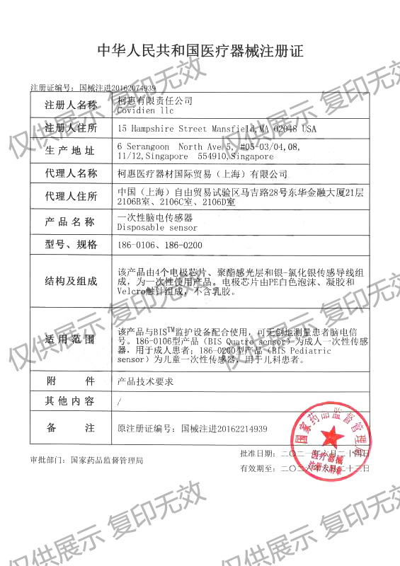適用范圍:該產(chǎn)品與BISTM監(jiān)護(hù)設(shè)備配合使用,可無創(chuàng)地測量患者腦電信號(hào)。186-0106型產(chǎn)品(BIS Quatro sensor)為成人一次性傳感器,用于成人患者;186-0200型產(chǎn)品(BIS Pediatric sensor)為兒童一次性傳感器,用于兒科患者。