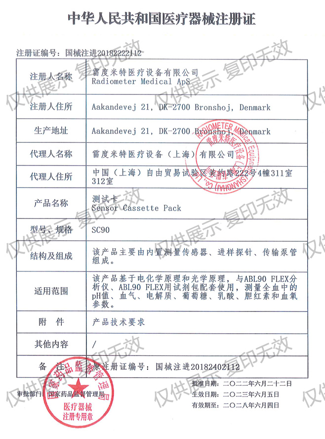 雷度ABL90血?dú)鉁y試卡注冊證編號:國械注進(jìn)20182222112