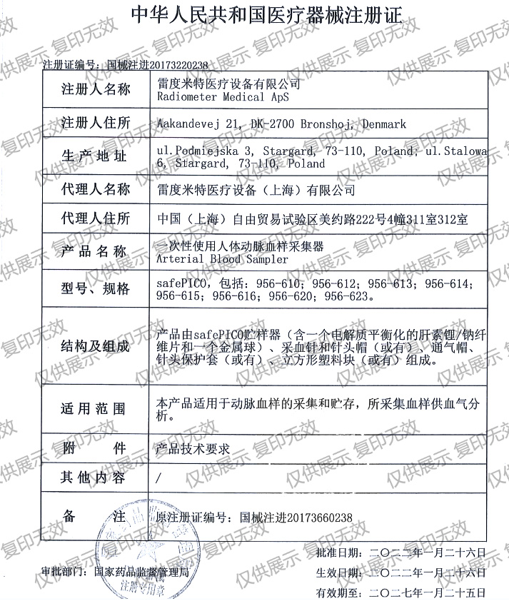 雷度safePICO一次性使用人體動(dòng)脈血樣采集器