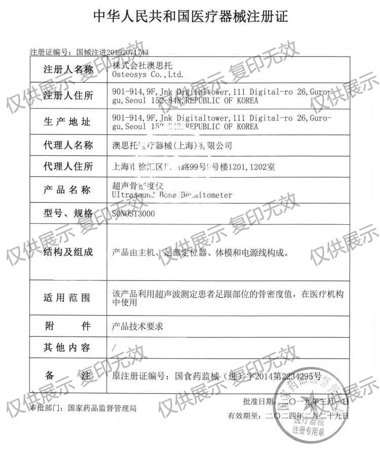 適用范圍:該產(chǎn)品利用超聲波測(cè)定患者足跟部位的骨密度值,在醫(yī)療機(jī)構(gòu)中使用。
